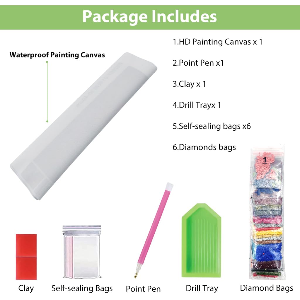- Comprehensive diamond painting kit includes colored diamonds, pickup pen, glue clay, and bags for organized use.