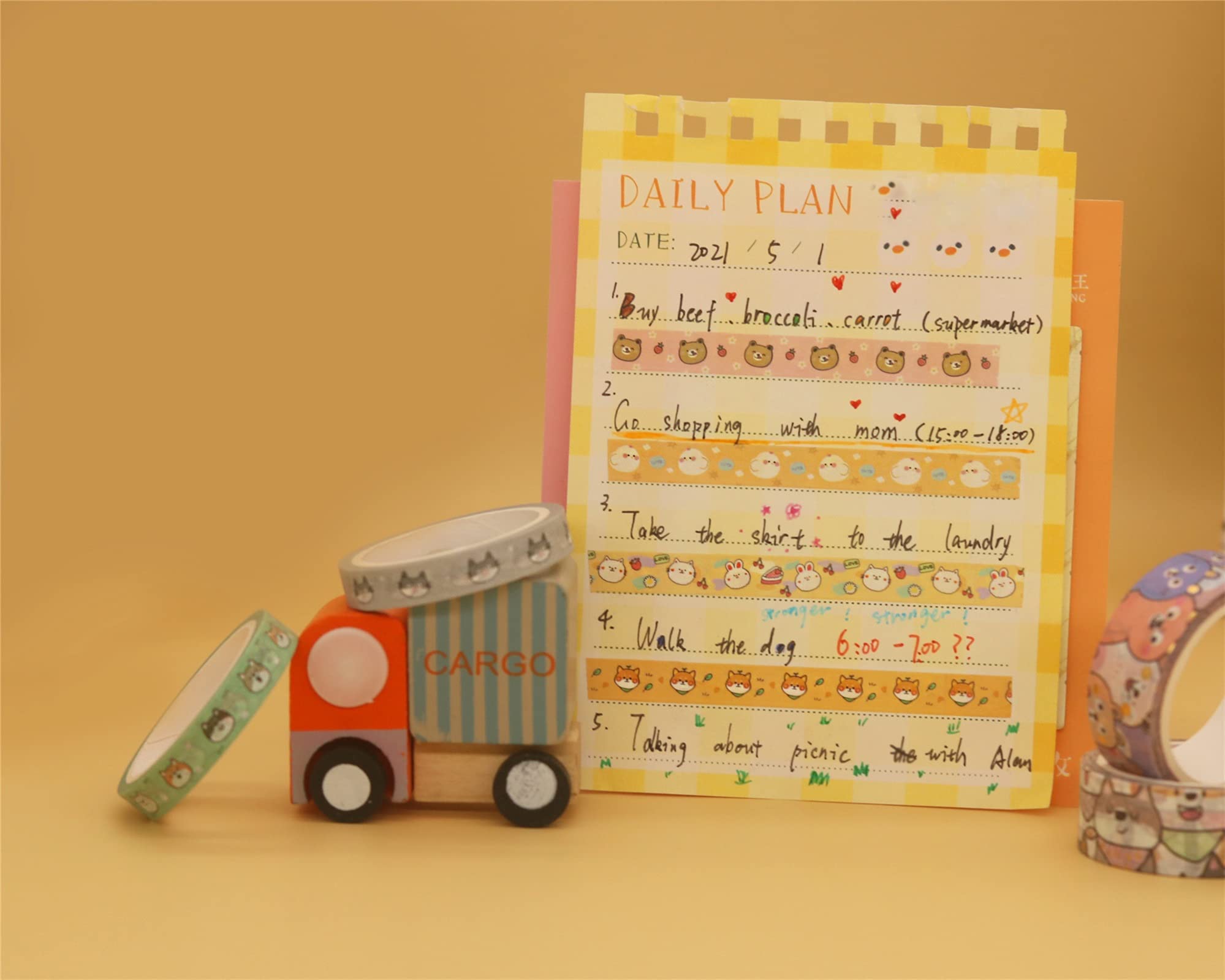 - Includes 18 rolls of decorative washi tape in two widths and multiple cartoon designs.