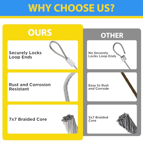 - VERSATILE LOOP-ENDED STEEL WIRE ROPES: The loop-ended design ensures easy installation and adaptability, enabling you to use these steel ropes for various purposes. Whether you're hanging flower pots, hanging plants, creating a cozy lighting setup, or displaying artwork, these versatile hanging pots for plants ropes cater to your every need with professional-looking results.