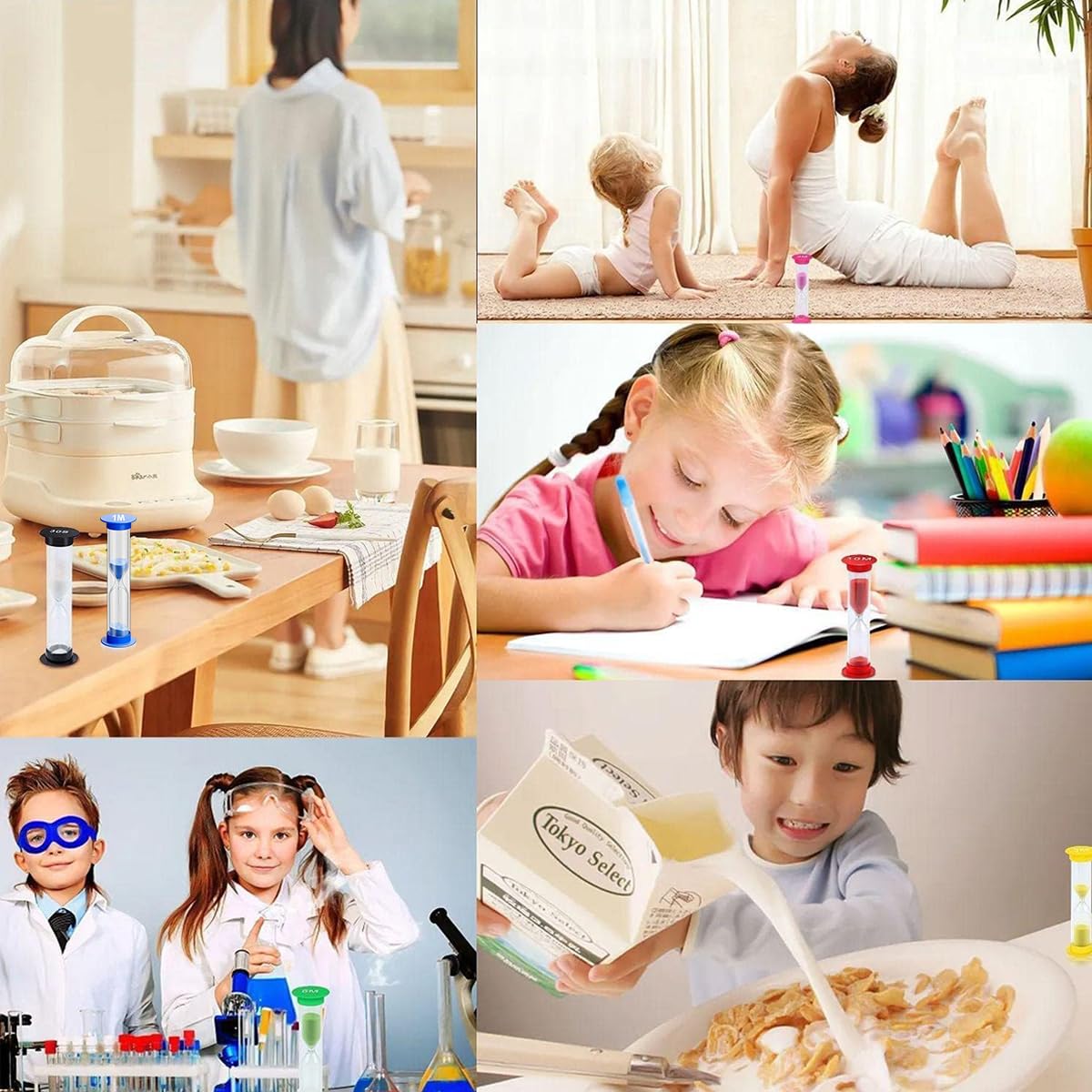 HASTHIP 6PCS Small Sand Timer Hourglass Sandglass Sand Clock Timer combines colorful design and practical timing in one compact set. This kit includes six sand timers in black, blue, pink, yellow, green, and red, each measuring 8.8 cm high and ideal for intervals of 30 seconds, 1, 2, 3, 5, and 10 minutes. Made with durable PVC caps, a sturdy glass body, and colored sand, each timer stands stably on flat surfaces. Compact and portable, they are suitable for classrooms, kitchens, offices, or daily routines such as brushing teeth and games. Designed for simple time awareness rather than precise chronography, this HASTHIP set helps users improve time management and everyday efficiency.