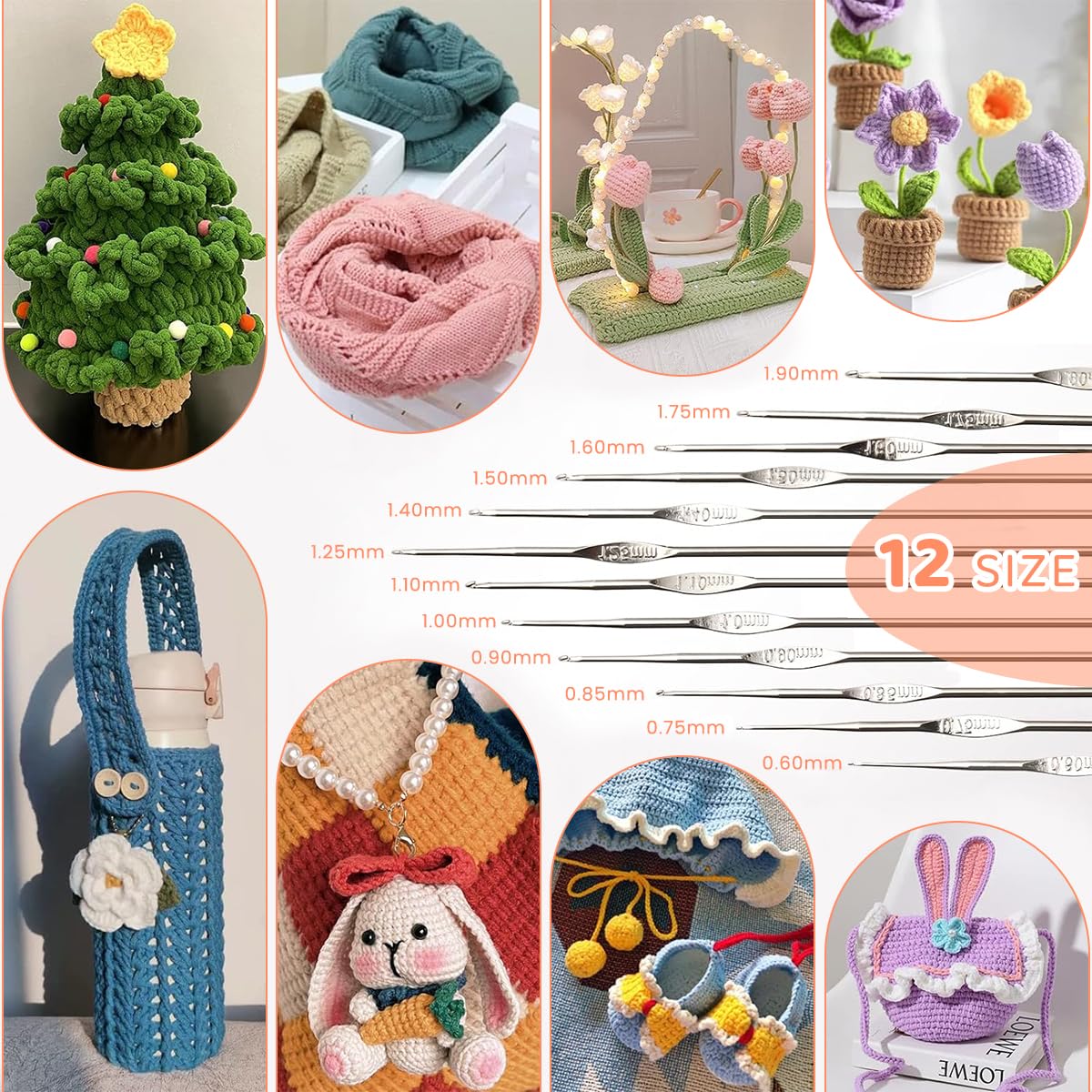 - Offers hook sizes from 0.6mm to 6mm for projects ranging from fine lacework to chunky yarn designs.