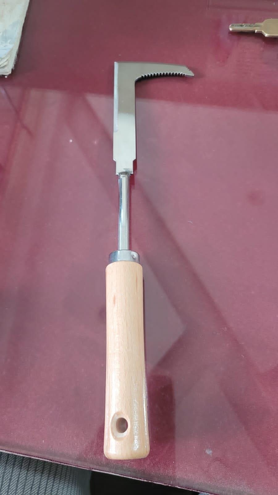 • Designed with an ergonomic wooden handle for improved comfort and control.
