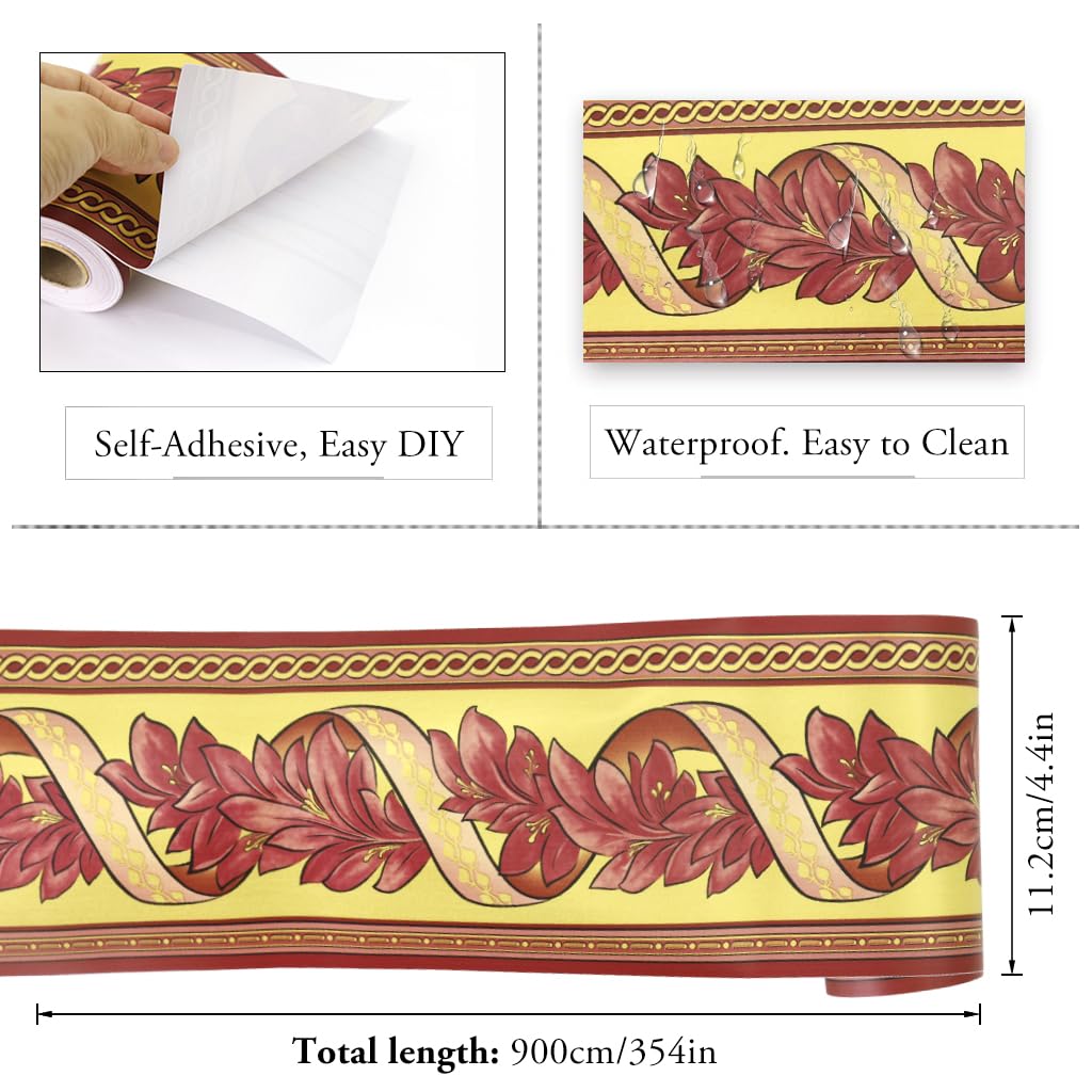 HASTHIP Waterproof Floral Wall Stickers for Kitchen and Bathroom 3.9 in × 29.5 ft PVC Border | Reddish Brown Self Adhesive Trim
